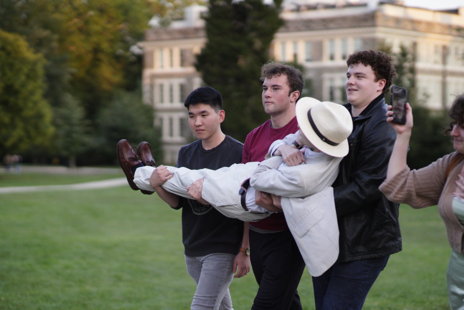 Just as the sizable crowd on Founders Green was beginning to grow restless, a loud gasp echoed from somewhere toward the back. The students turned around. For a moment, all you could hear was their hushed shock. Then, laughter. Haverford senior and campus celebrity, Ben Fligelman, was being carried up the long walkway from VCAM to Founders, arms crossed dramatically, as if entombed in a coffin.