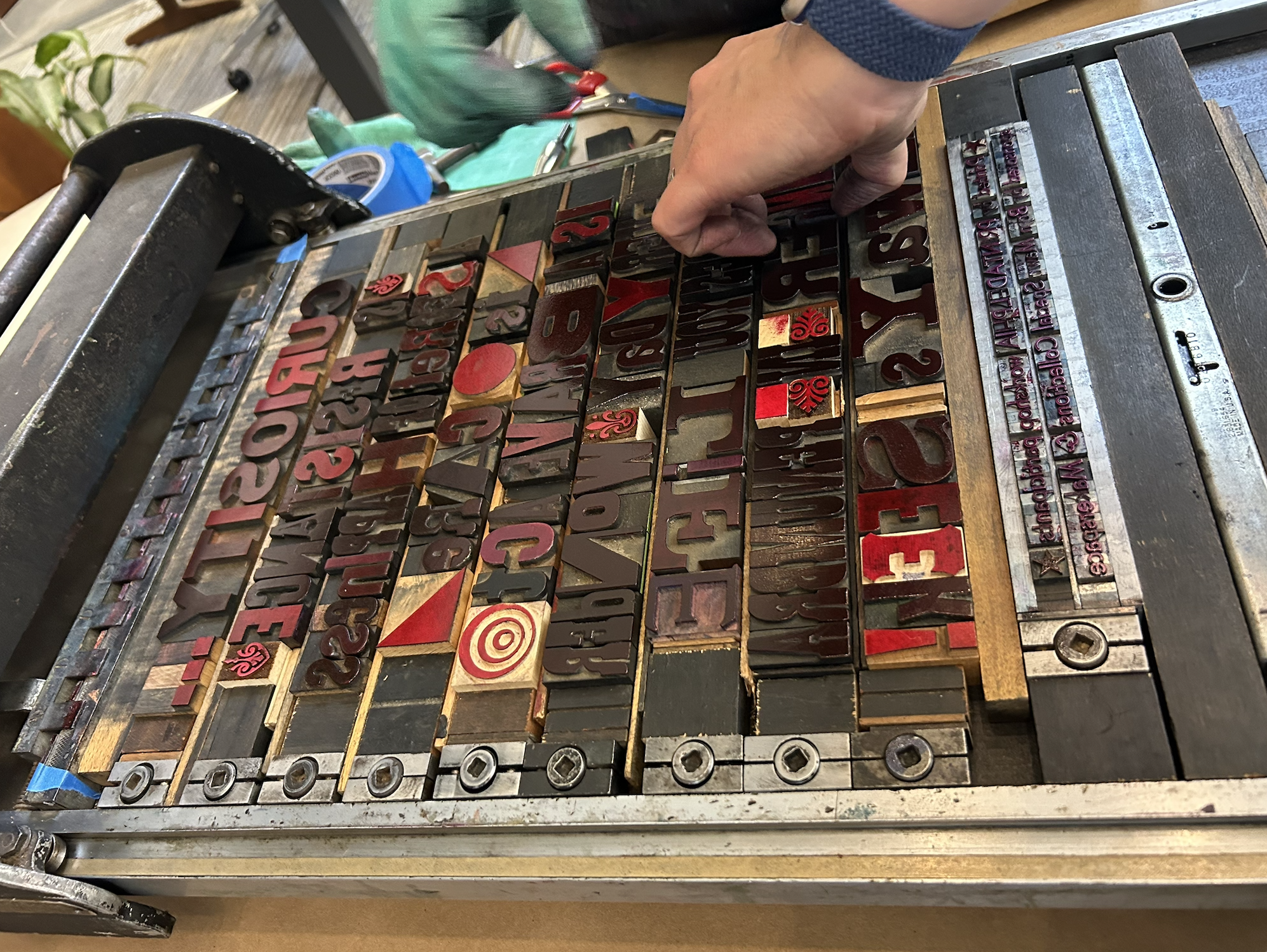 Marisha Simons, founder of Printadelphia, introduced the group to the sets of type available, which included a full set of vintage Garamond type and a set of typefaces consisting of practically any type of letters one could imagine, to achieve a “ransom-note” look. All typefaces, however, are a standardized height, making it possible to mix and match.